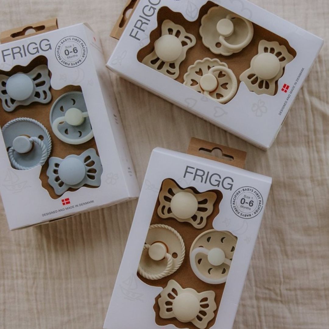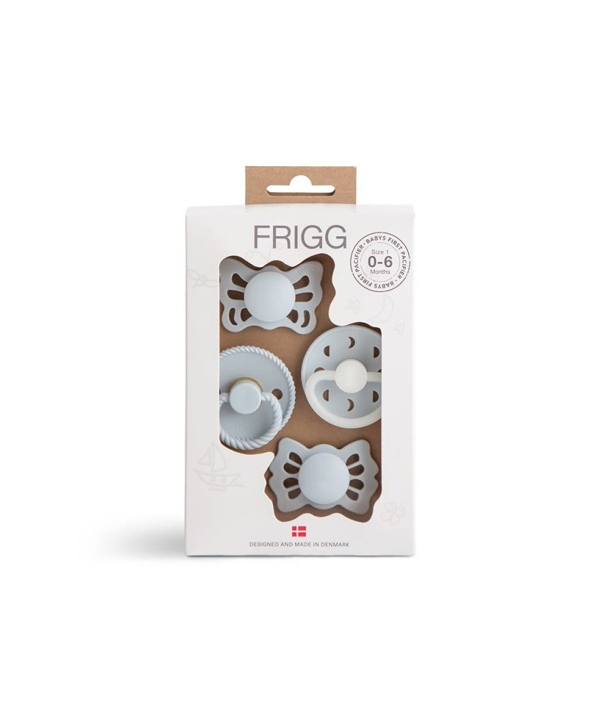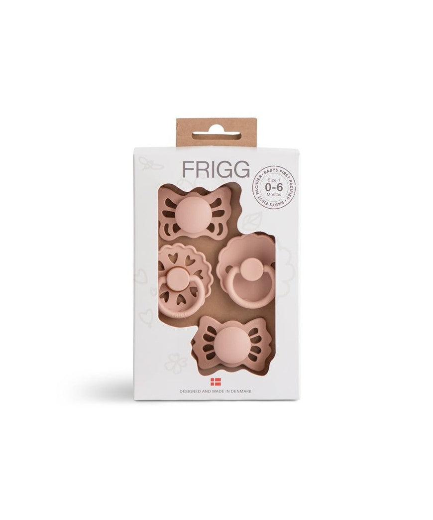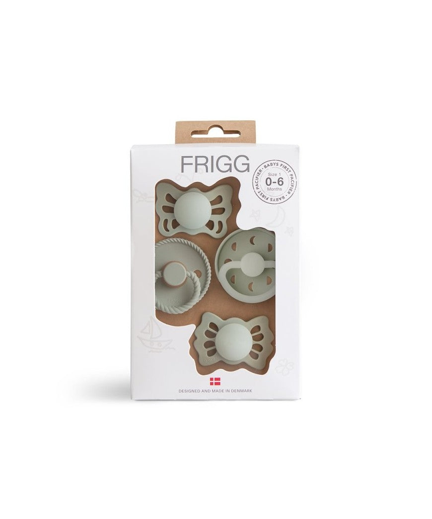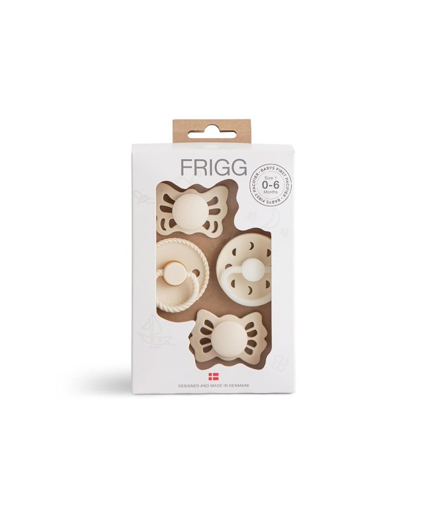 El pack de 4 chupetes FRIGG Baby's First se compone de: 1 x FRIGG Mariposa (tamaño 1, tetina anatómica de silicona médica) 1 x FRIGG Fairytale (tamaño 1, tetina redonda de caucho natural) 1 x FRIGG Daisy (tamaño 1, pezón redondo de silicona médica) 1 x FRIGG Lucky (tetina simétrica de silicona médica)