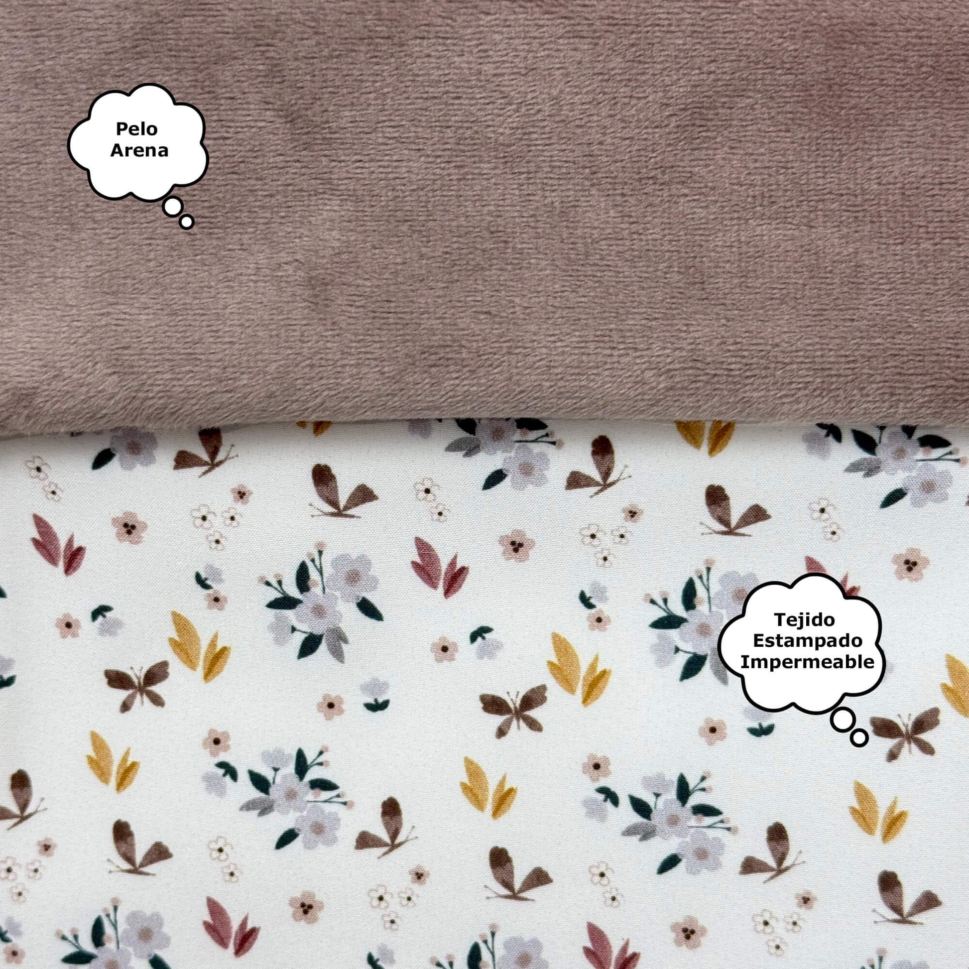 *La funda en tejido villela o pelo liso, en la zona de los pies para las rozaduras de los zapatitos y la suciedad un tejido muy resistente de fácil limpieza.
