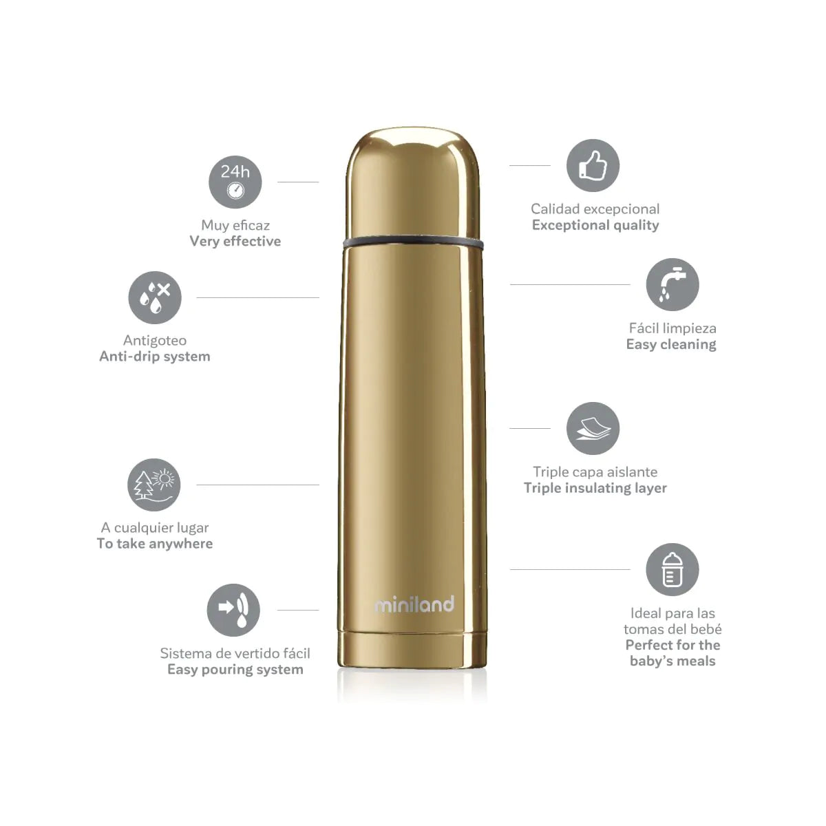 Los thermys deluxe de Miniland presentan una alta resistencia y eficacia gracias a su doble pared de acero, su exclusivo revestimiento de aluminio y su cámara de vacío.